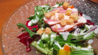 ![]() 白菜の上にホタテとイクラがのった前菜 |