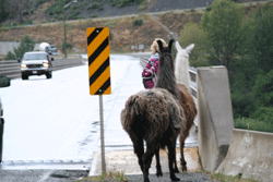 に入り、キャッシュ・クリークCache Creek からHwy-99 に入る。雨がぱらついてきた。車を止めて写真を撮っていると見慣れぬ動物をつれたおばさんがやってきた。あれって、リャマ?アルパカ?確かボリビアとかペルーとか、南米にいてる動物だと思うけど、飼っているのかな?おばさんは、ニコッと笑って去って行った。
