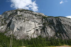 ウィスラーを出て50分ほど走っただろうか?道の左手に巨大な岩山が見えてきた。ガイドブックを調べてみるとスコーミッシュと言う街の近くにあるロッククライミングの人気スポットらしい。確かに垂直に切り立った岩壁はロック・クライマーが喜びそうな岩山です。岩山から少し行くと滝の案内標識があったので立ち寄ってみる。シャノン滝