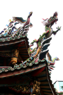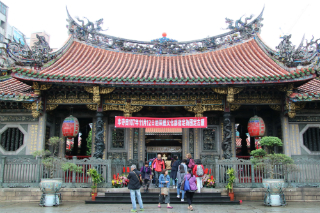 ベンチに座っておしゃべりを楽しむ老人達の側を通り抜けるとすぐに龍山寺が見えてきます。龍山寺は270年ぐらい前に建立された台湾でもっとも古い寺で,建物の各所の凝った装飾が興味深いです。