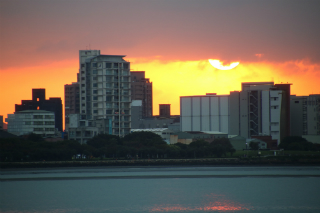 食事が終わって外に出ると淡水河の対岸に雲の切れ間からきれいな夕陽が見えてきました。今日は曇り空だったので諦めていましたがラッキーでした。