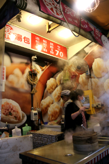 川沿いの遊歩道から一本奥の中正路といういろんな店が立ち並ぶ賑やかな道を駅の方へぶらぶら歩いていると白い湯気がもうもうと上がっている店を見つけました近寄っていくと「湯包」という看板が上がっていて小籠包の写真が壁に貼ってありました。先客が買ったばかりの小籠包を店先で美味しそうに食べていたので、私たちも8個入りを買って店の横の小さなカウンターで頂きました。一口噛むと中から熱々のスープがあふれ出した来て、すごく美味しかったです。食べたい(飲みたい)ものリスト@小籠包、ゲットしました。