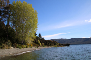 | テ・アナウの20kmほど手前のマナプーリ湖に到着。かなり大きな湖で、対岸に雪を抱いた山並みが見えます。風がきつくて湖ですが白波が立っています。 |