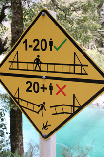 駐車場からしばらく森の中を歩いていくと吊り橋が見えてきました。20人までの人数制限のある標識がやけにリアルです。 |